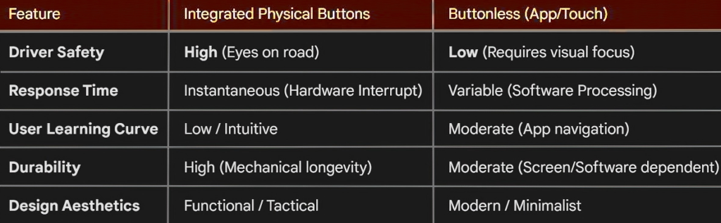 - Emergency Response: In the event of a collision, a physical “Lock/SOS” button is far easier to trigger under stress than a software-based icon on a vibrating screen.