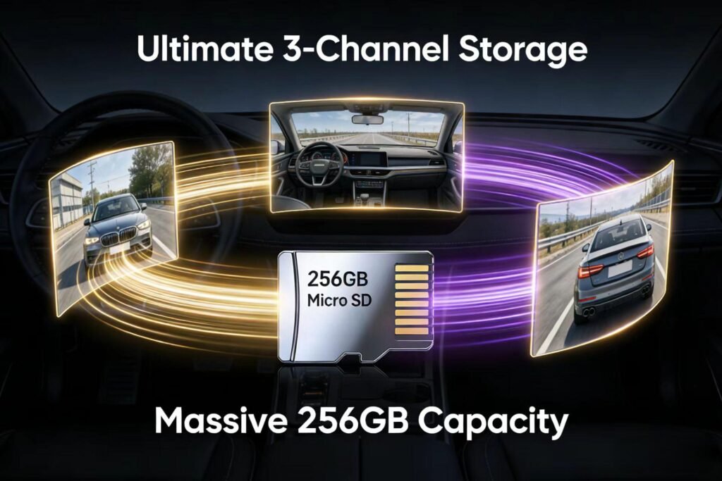 If you have a 3-channel (Front 4K + Cabin 1080P + Rear 1080P) or 4-channel system, the data throughput is massive. You are effectively writing three or four video files at the same time. A 128GB card would fill up in less than 3 hours in a multi-channel 4K setup. This makes it impossible to capture a full morning of driving. For professional 3/4-channel systems, 256GB is the standard configuration. It provides the necessary “buffer” to ensure high-bitrate data from all cameras is stored safely without constant, stressful overwriting.